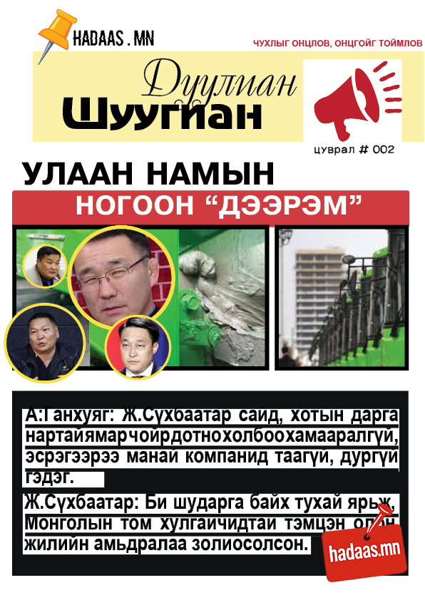-За ах. Тэр цаас маас яах вэ. Дүү нар нь янзалчихна. Нам сонгуульд ялахад мөнгө хэрэгтэй байгаа. Дарга таны данс руу мөнгийг гэрээнд заасан хугацаандаа хийчихнэ гэсэн. Та харин орсон мөнгө болгоноос 30 хувийг “кэйш”ээр нь нөгөө буудалдаа авчирна шүү. Дансаар шилжүүлж, мөр үлдээж болохгүй, “кейш”-ээр шүү. Бид намдаа бүгдийг өгнө(яг харагдаач).